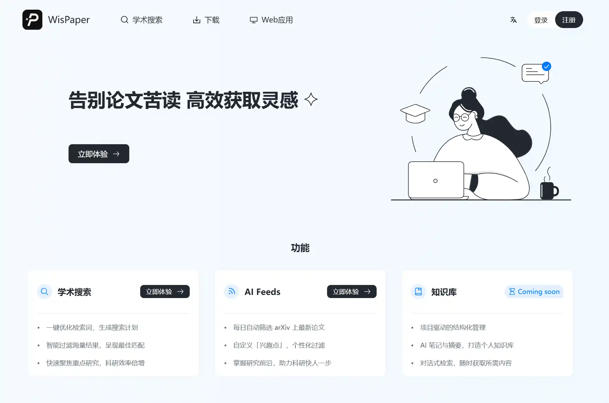 「WisPaper」是复旦大学团队研发的 AI 学术工具,聚焦 “搜文献 + 读文献” 两大核心场景,能帮助科研人员解决外文文献检索难、阅读效率低、重点难提炼等问题,目前处于免费内测阶段。
