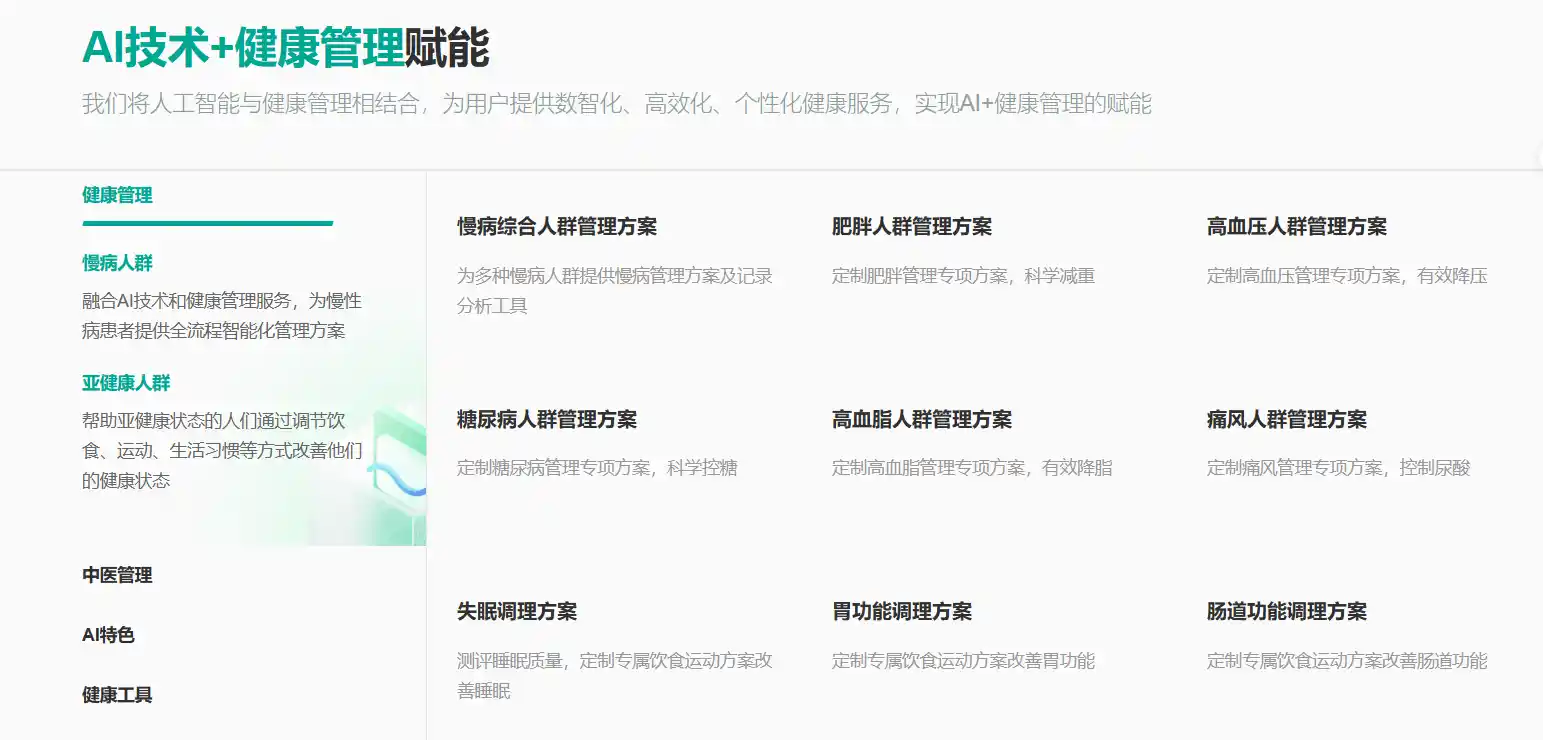 - 垂直领域深度聚焦:专注于健康医疗细分场景,覆盖疾病风险预测、健康干预方案、健康数据管理、用户行为分析等全流程需求,解决传统健康服务中数据割裂、专业门槛高、服务效率低等痛点;