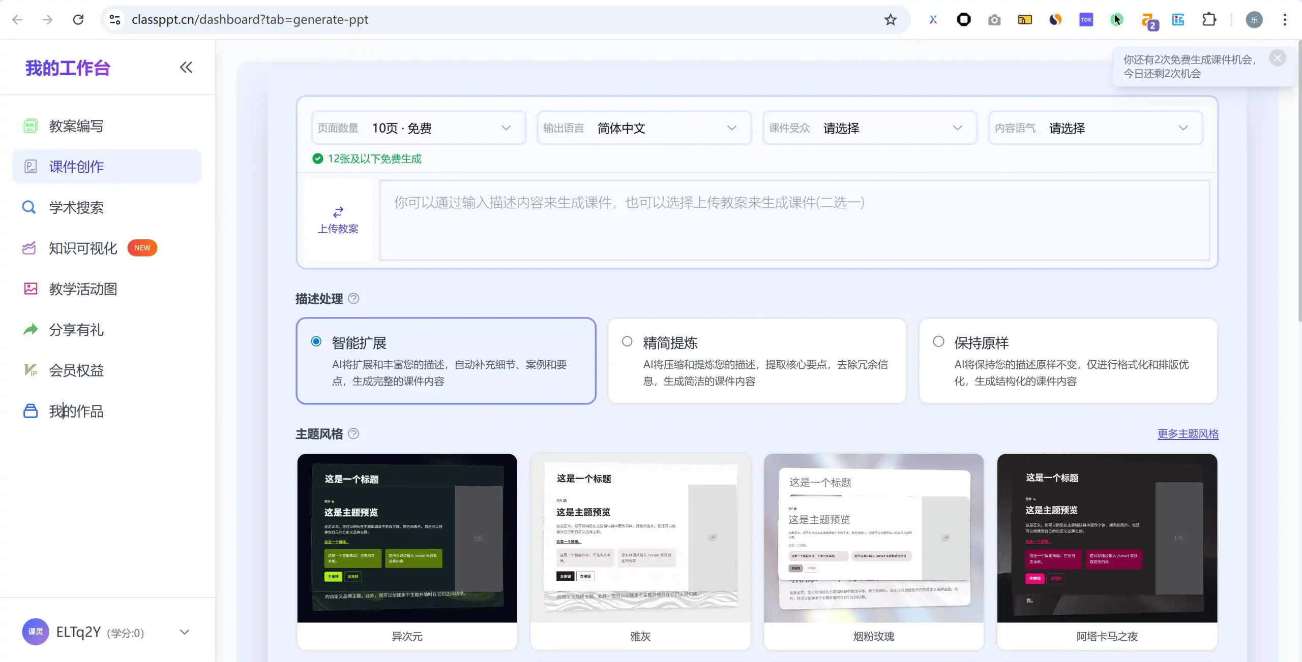 AI 生成 PPT课件:用户输入主题或上传教案,平台在2分钟内自动完成排版、配图和风格匹配,支持 150+ 主题风格,生成的 PPT 兼具美观与专业。