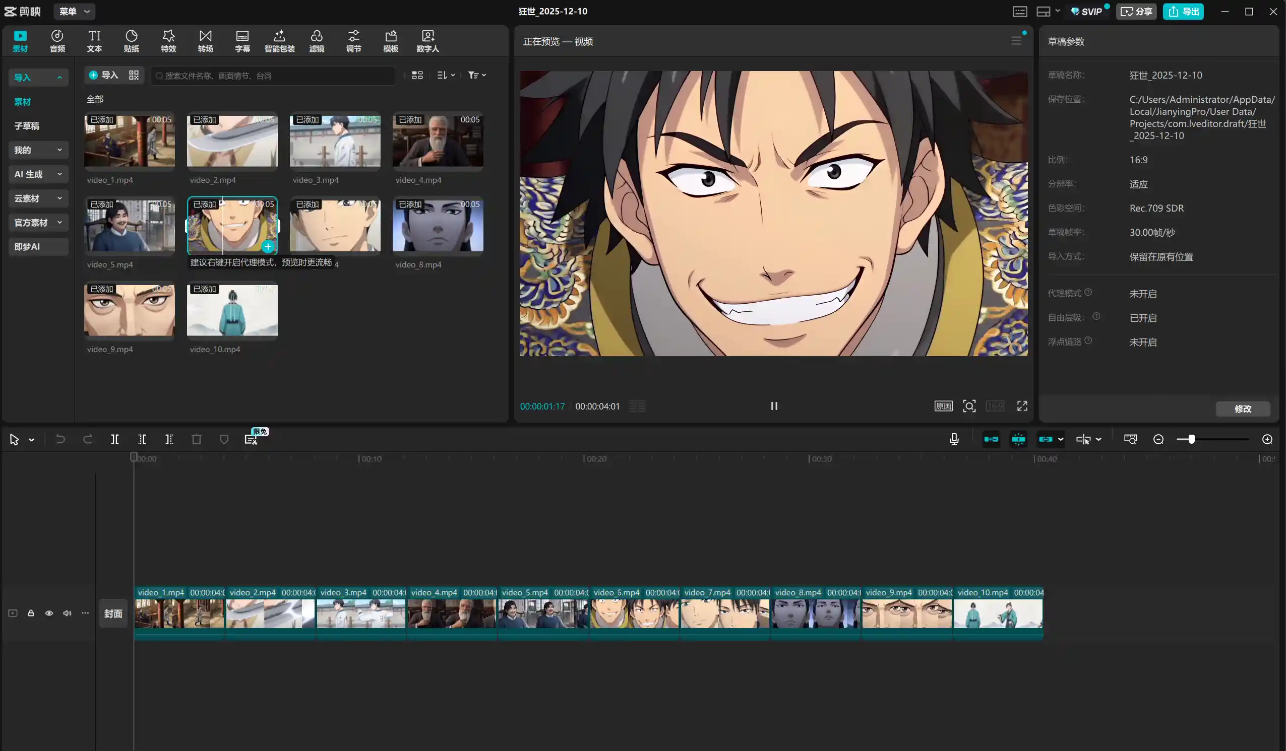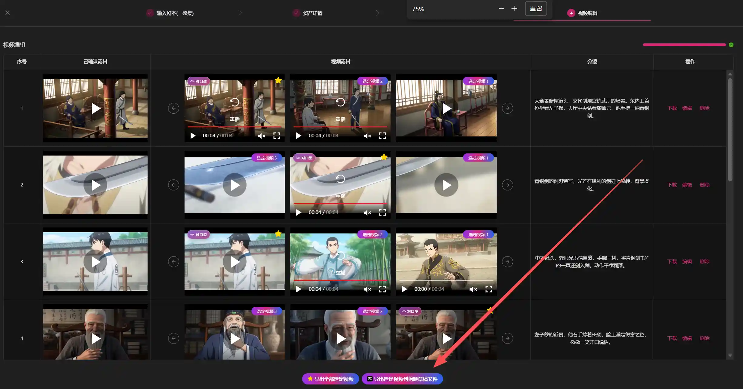 在AI完成剧本拆解和资产匹配后,在分镜页面,你可以预览每个镜头的预设。如果对AI拆解的某个动作或景别有自己的想法,可以直接手动修改。接下来你可以直接导出视频或者直接导出剪映草稿文件直接进行编辑