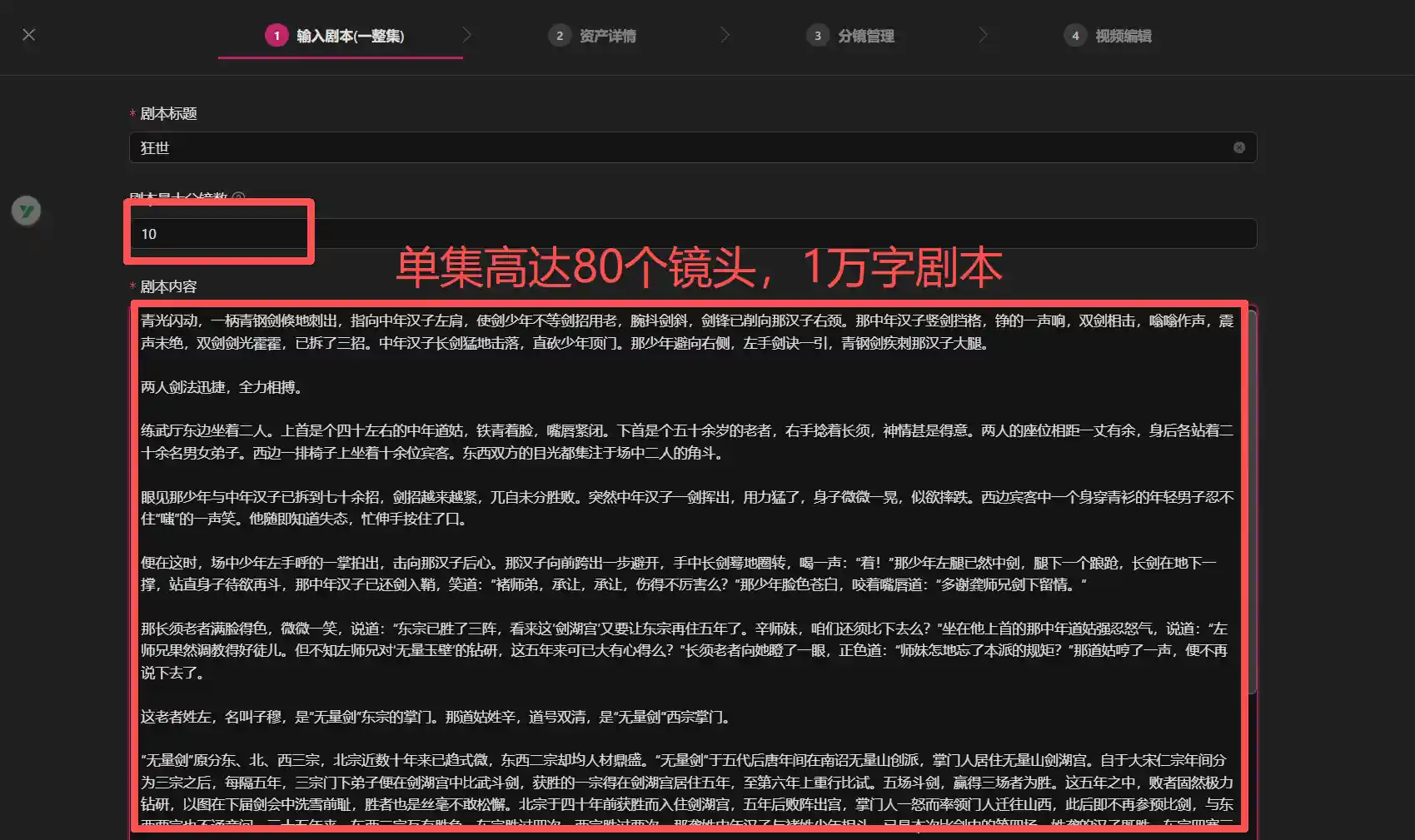 •全集剧本承载: 支持万字级别的剧本内容输入,确保故事的完整性与连贯性。