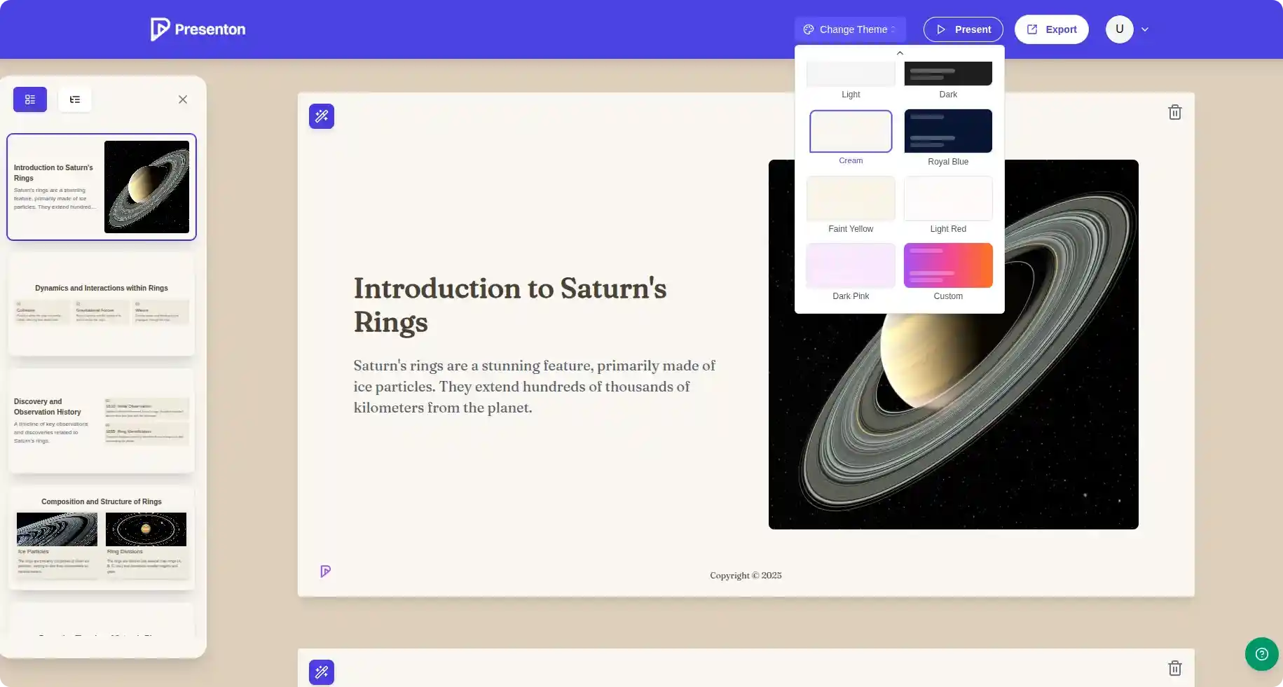 基于上述理念,Presenton提供了一套覆盖演示文稿创作全流程的功能: