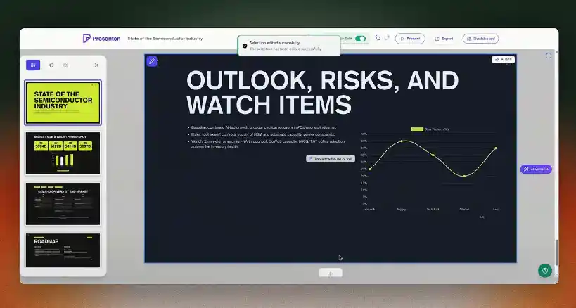 • 完善的生产输出:所有生成的演示文稿均可导出为标准且兼容性极高的 PPTX格式,方便在Microsoft PowerPoint或WPS中进行最终的细节调整和协同编辑;也可直接导出为PDF格式,用于分享和打印